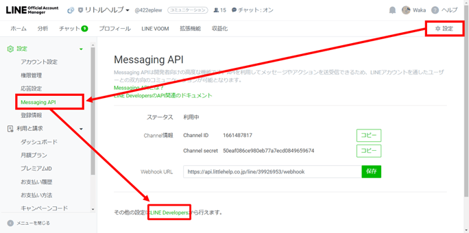 ※実際は「リトルヘルプ」というカードではなく、接続するLINE公式アカウントが表示されています。またここまでの手順で別なチャネルを開いた場合など、進め方によっては一番左には無い可能性もございます。-png.png?width=686&height=767&name=LINE-Developers%20(1)-png.png)