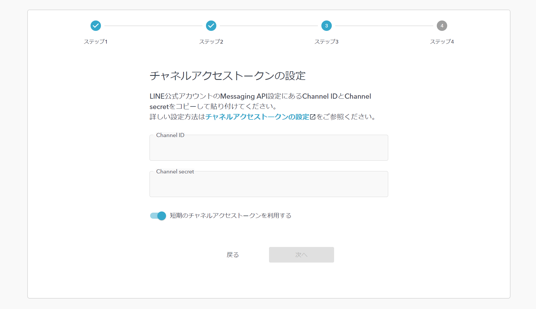 Channel IDとChannel Secretの設定に遷移します。