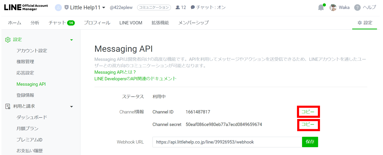LINE Official Account ManagerのChannel IDとChannel Secretをコピーして
