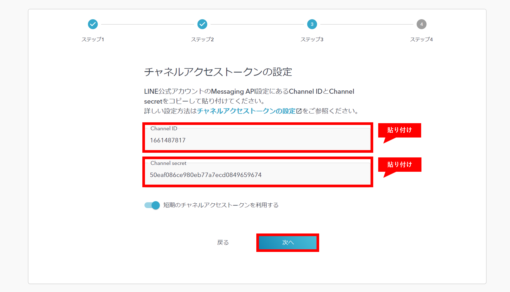 今セットアップしているチャネルIDと、LIEN Developersに表示されているチャネルIDが異なる場合、1つ前の画面に戻り正しいLINE公式アカウントのカードを選んで下さい。