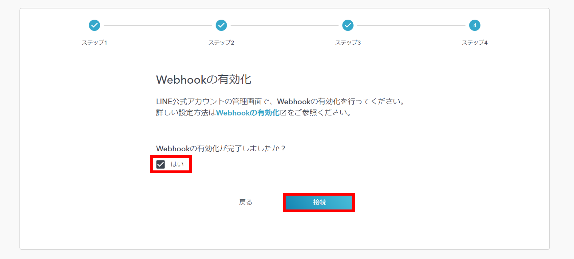 「Webhookの有効化が完了しましたか?」は「はい」にチェックを入れ、「接続」を押します。