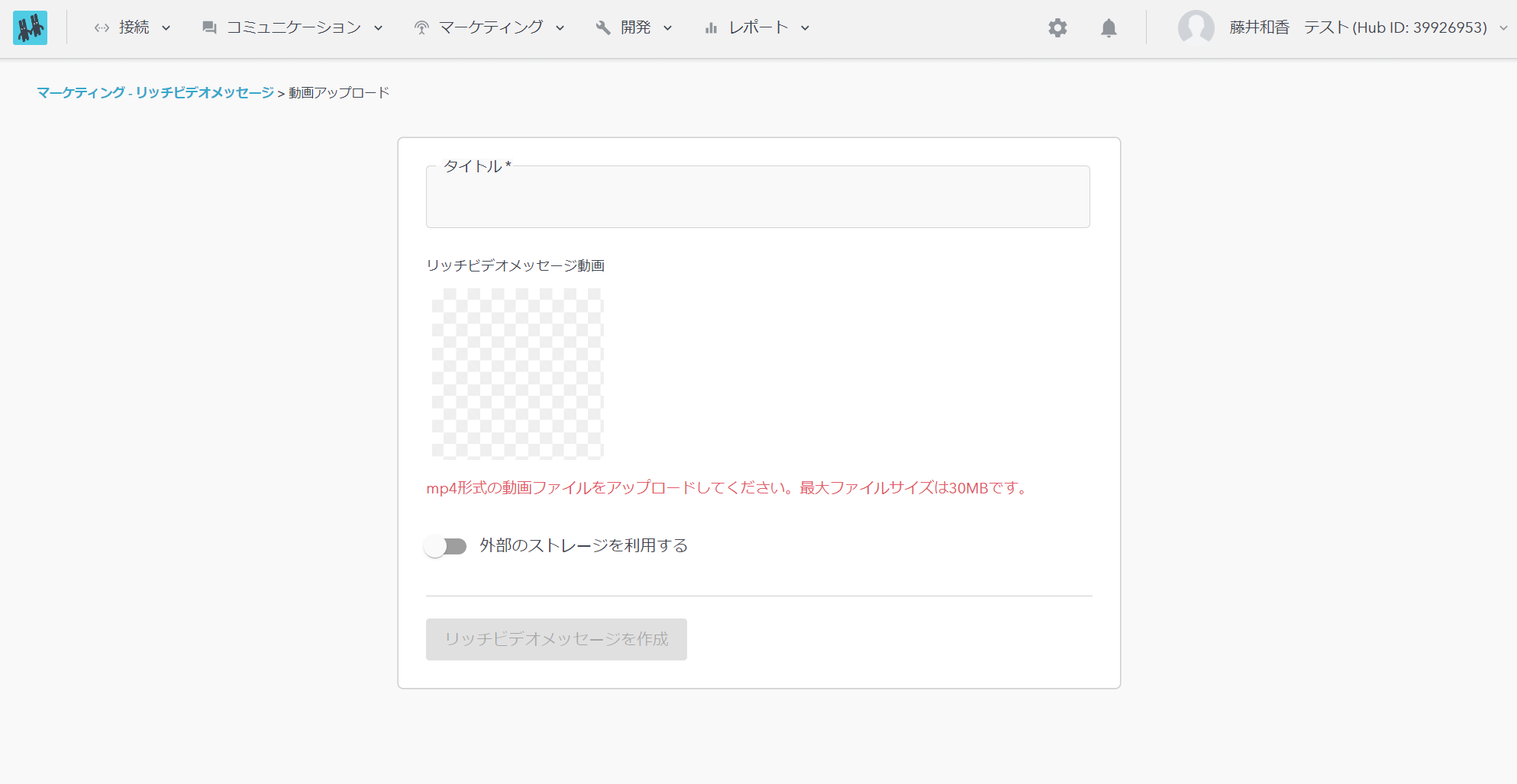 動画ファイルの最大サイズは30MBまでです。30MBを超えるサイズのファイルをアップロードする場合、「外部のストレージを利用する」をONにしてください。