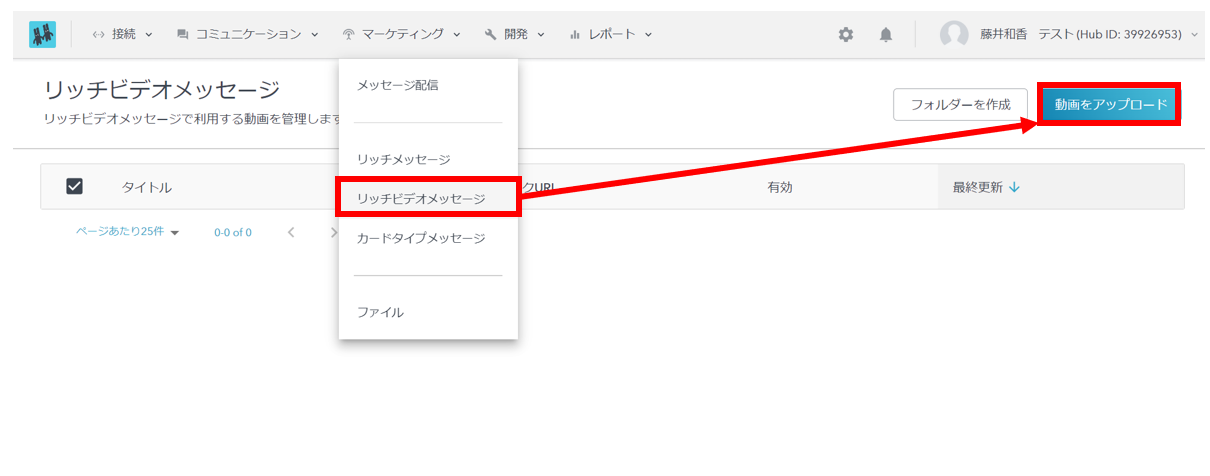 リッチビデオメッセージを登録するには、始めに動画をLITTLE HELP CONNECTにアップロードします。管理画面のメニュー「マーケティング>リッチビデオメッセージ>動画をアップロード」を選択してください。