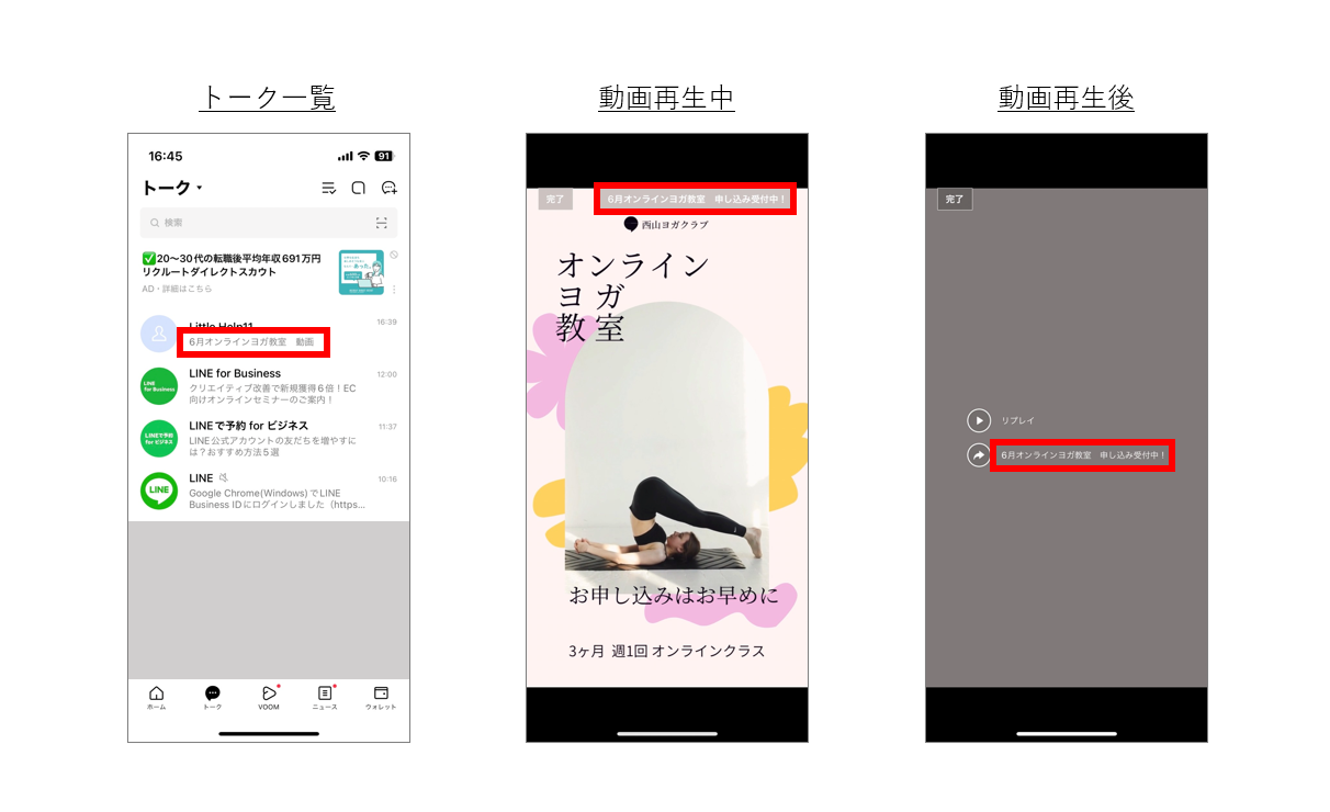 - テキスト:トーク一覧画面、動画再生中、再生後にお客様に表示されるテキストです。
