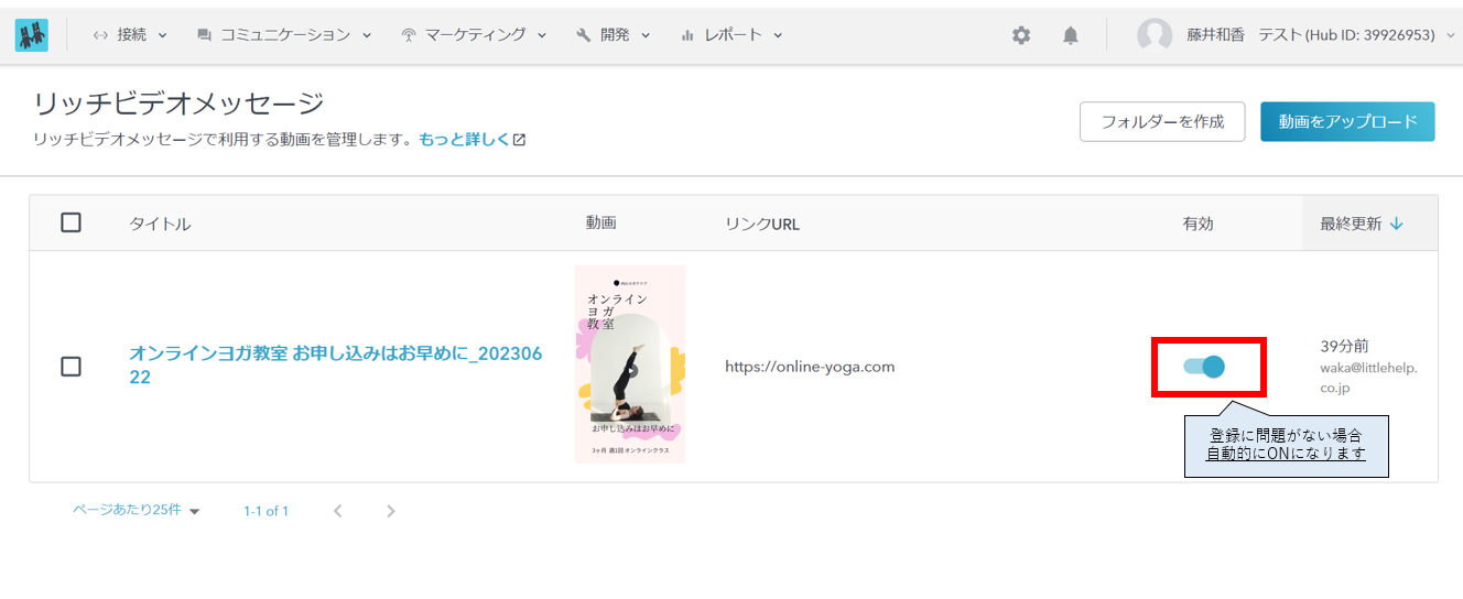 リッチビデオメッセージの一覧に戻ると、ビデオが「有効」かどうか確認できます。詳細設定の内容に問題がない場合、自動的にONに、メッセージ配信で利用できる状態となります。
