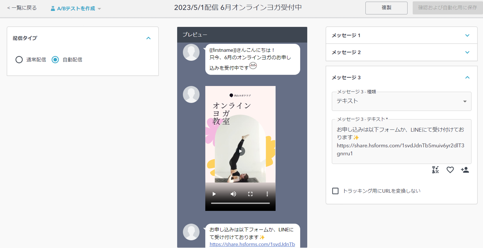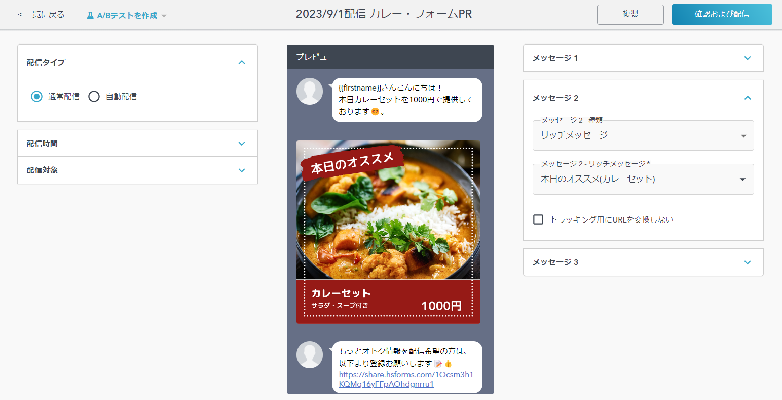 - 特定の配信先リストの全員に対し、決まった時間にメッセージを一斉配信したい場合にご利用いただくメッセージタイプです。
