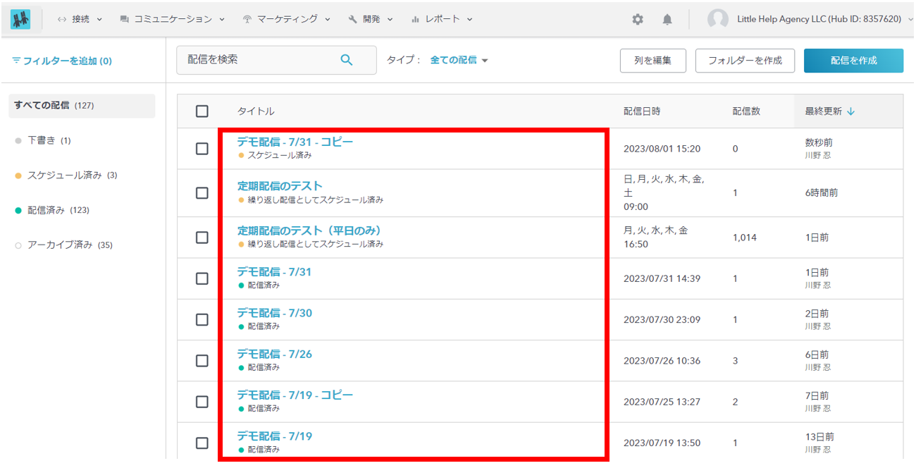 LITTLE HELP CONNECTでは、「TOP>マーケティング>メッセージ配信」に登録された「タイトル」ごとに各種パフォーマンスの計測をすることができます。