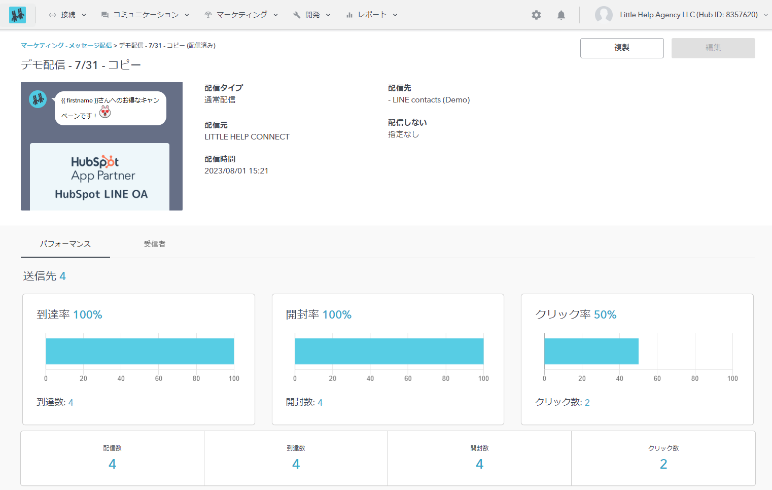 - 本メッセージが送信されたLINE友だちの数です。ブロックされてる友だちに送信する場合も、送信数に含まれます。配信対象者が、HubSpot上で「LINE User ID」の情報を保有していない場合、送信先には含まれません。