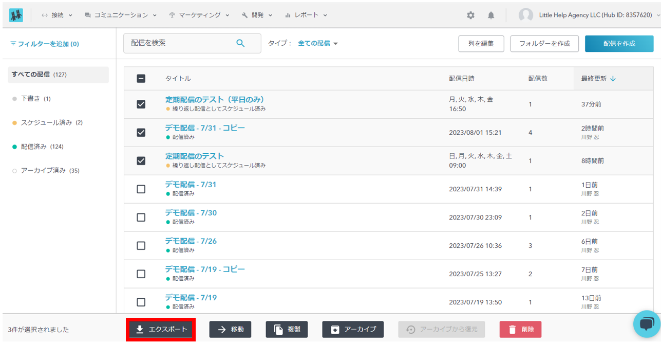 LITTLE HELP CONNECTのパフォーマンスの数字は、CSVでエクスポートすることができます。エクスポートするには、メッセージ配信の「タイトル」一覧で、エクスポートしたいタイトルにチェックをつけ、「エクスポート」してください。