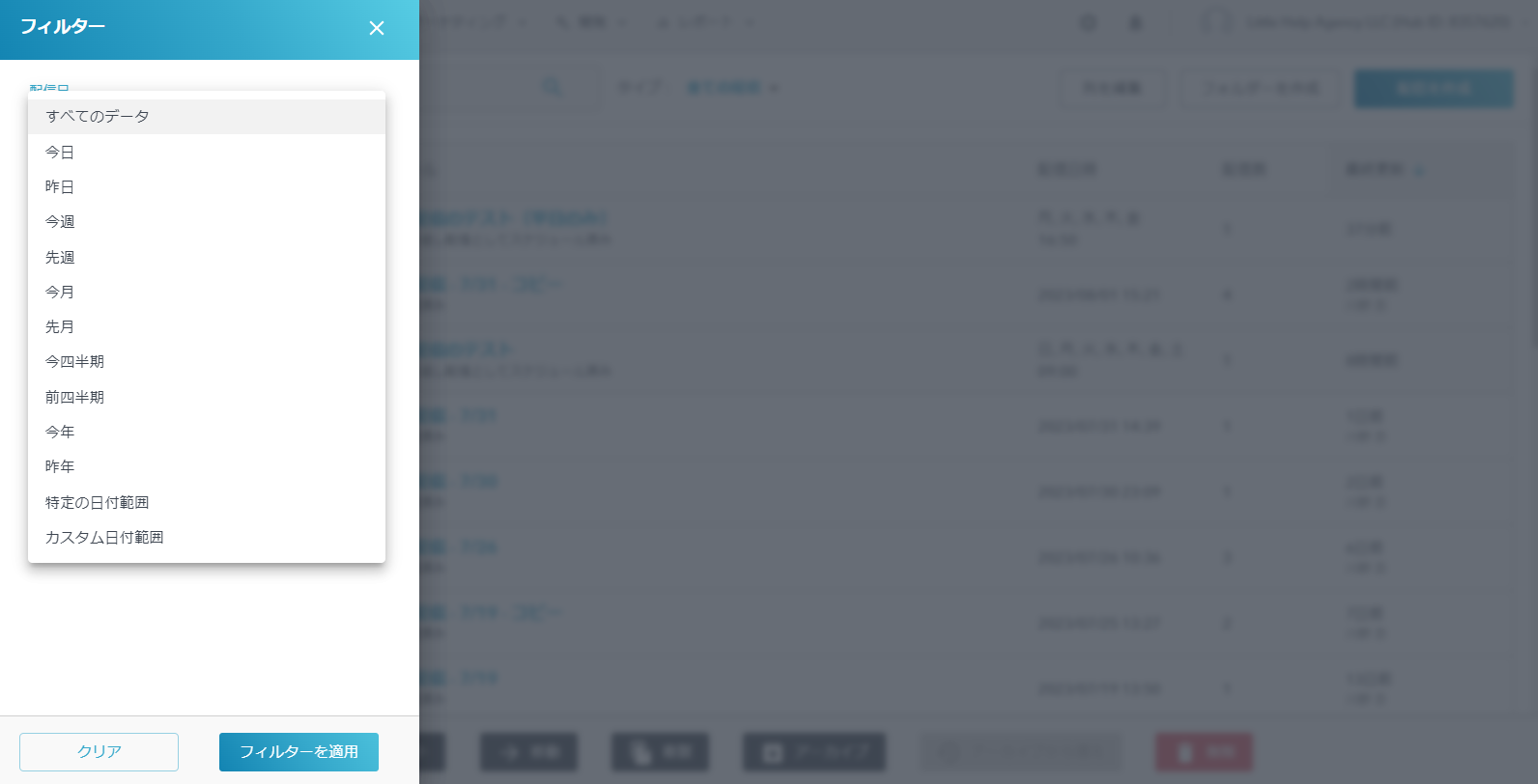 特定期間の配信を一括でエクスポートしたい場合、左上の「フィルターを追加」から期間を指定して配信を絞り込んだ上でエクスポートしてください。