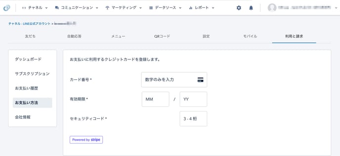 「TOP>チャネル>LINE公式アカウント>該当のLINE公式アカウントを選択>利用と請求>お支払い方法」から変更が可能です。